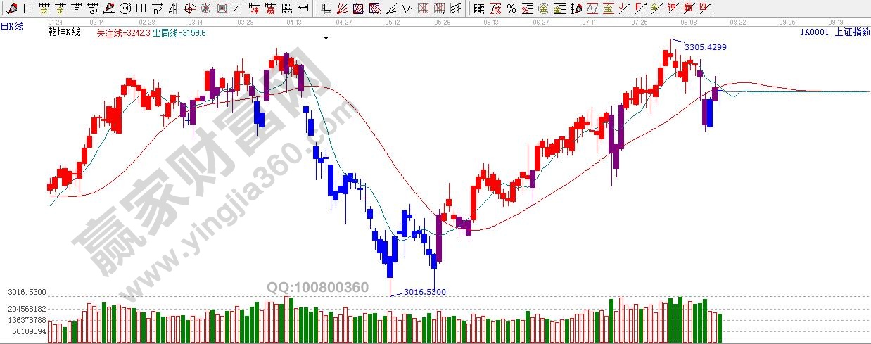 ★依據贏家江恩理論系統乾坤K線提示:紫色k線,反抽紅色關注線,依據股指,在未站穩紅色關注線之前,保持謹慎。