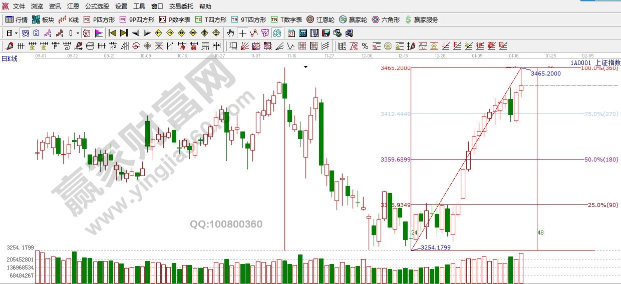 江恩看盤(pán)綜述:依據(jù)贏家江恩技術(shù)工具分析得出:周三,滬指再次強(qiáng)勢(shì)上攻,突破前期高點(diǎn)再創(chuàng)新高。并觸及極反通道日線藍(lán)色外軌線,依據(jù)規(guī)則,藍(lán)色外軌線短期會(huì)有一定的拋壓,短期需注意沖高回落以及震蕩的情況出現(xiàn)。藍(lán)色線阻力是3475點(diǎn)附近,支撐關(guān)注百分比270度3412點(diǎn)附近,下一時(shí)間窗口是1.22日附近。操作上,回避近期漲高的藍(lán)籌,關(guān)注調(diào)整過(guò)后的低位業(yè)績(jī)不錯(cuò)的標(biāo)的。