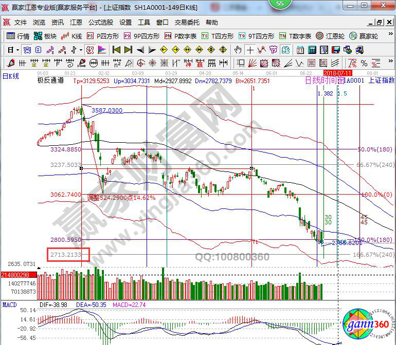 ☆依據(jù)贏家江恩理論系統(tǒng)波段百分比延伸線提示:日線跌穿180度2800點(diǎn),按照規(guī)則看低一線至240度2713附近。
