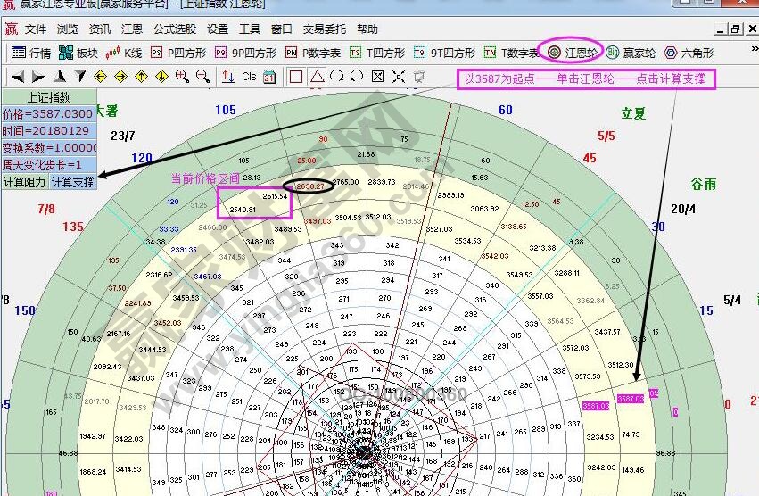 ☆依據(jù)贏家江恩理論系統(tǒng)江恩輪中輪提示:以3587為起點,做江恩輪上輪時空分析圖??臻g上受阻2615壓力點,突破則進入下個角度2690;反則,將繼續(xù)確認2540支撐。