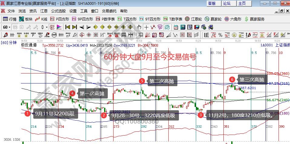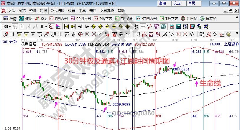 11月2號60分鐘周期在空間工具180度3210點獲得支撐,盤中解讀按此信號市場有反攻需求,6號倍數時間與百分比240度3289點形成共振,再度解讀反攻空間拓展至藍色上軌線,10號高開完成上攻空間開始震蕩回落。按贏家江恩投資體系十六字真言“看大做小、看長做短、牛長熊短、紅肥綠瘦”,市場遇阻回落最先要確認的周期及支撐信號是什么?60分鐘懸空應當如何判斷次日市場拐點?相信聽過關于周期關系推導、極反通道應對技巧的贏家學員,對這兩個問題心中都有評判的標準與答案,也會理解為何盤前直接鎖定到30分鐘周期,并且指定關鍵位是生命線,今日指數正好預期位收盤,聰明的投資者按此信號做尾盤交易,明天盤中就可擇機獲利高拋。先人一步抓住市場機會。