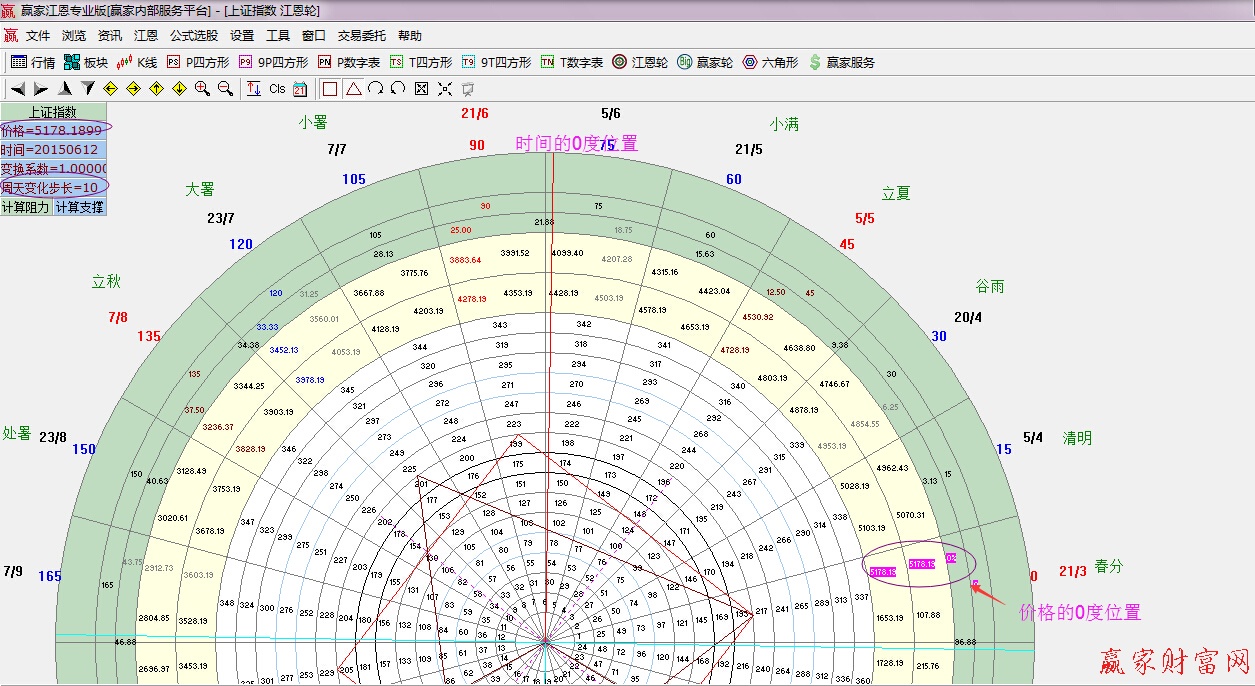今年的高點(diǎn)是5178點(diǎn),和24節(jié)氣"芒種"吻合,首先,選點(diǎn)5178點(diǎn)上方點(diǎn)擊鼠標(biāo)(會(huì)出現(xiàn)一個(gè)小三角),證明選點(diǎn)成功,下面打開江恩輪 ,觀察價(jià)格,時(shí)間和你的選點(diǎn)是否吻合,變換系數(shù)不用更改,周天變化歩長(zhǎng)可以放大或縮小10、100的倍數(shù)。我們把歩長(zhǎng)調(diào)成10,然后點(diǎn)擊上邊調(diào)試欄的旋轉(zhuǎn)按鈕,是三角形和四方形的結(jié)合點(diǎn)對(duì)準(zhǔn)起點(diǎn)位置【如下圖】,點(diǎn)擊計(jì)算支撐。