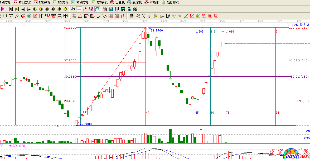江恩理論的時(shí)價(jià)共振去解釋一下特力A的漲與跌。