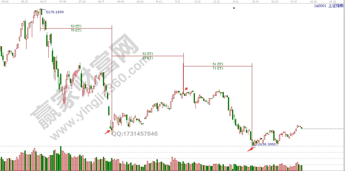 二,考慮每只個股并根據(jù)其自底部或頂部以來的所運行的時間距離來判斷它的趨勢。不管其它股票如何運動,每只股票都會按照它從自身的底部或頂部開始的5、10、20、30、50和60(日、月、年)循環(huán)來運行。