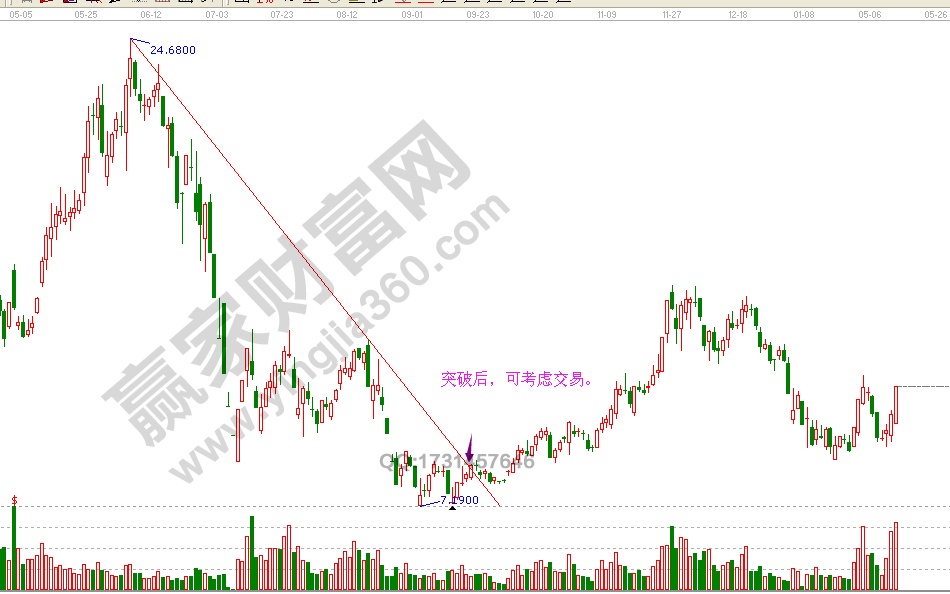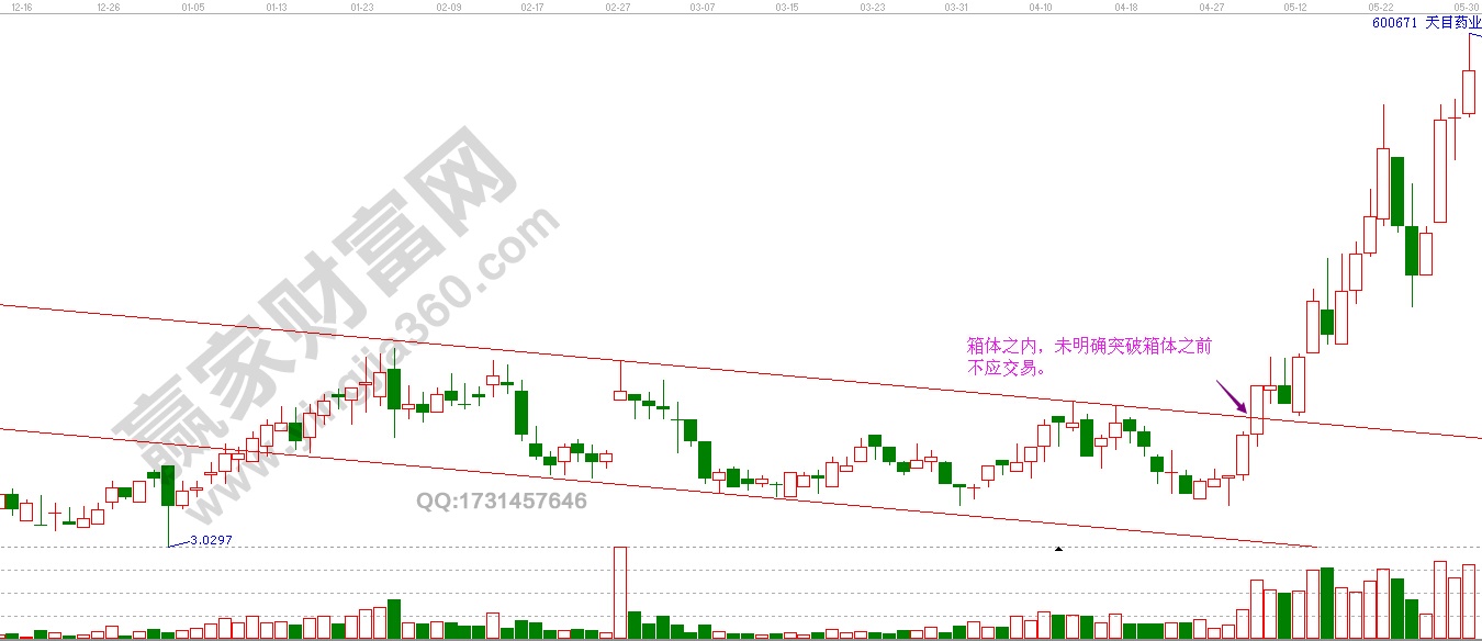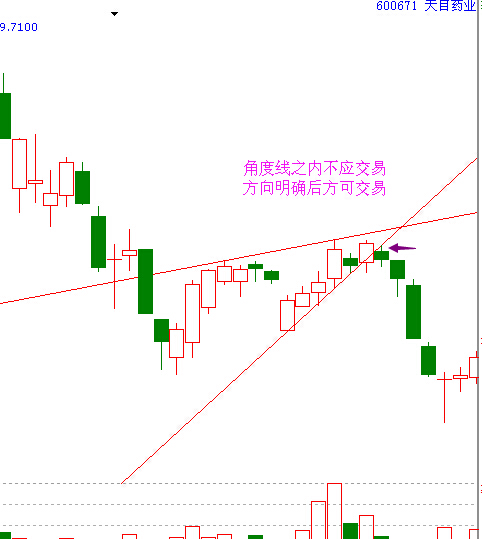 股票經(jīng)常會(huì)在一輪長(zhǎng)期的下跌之后收窄并在一個(gè)交易區(qū)間內(nèi)停留一段時(shí)間,此時(shí)在進(jìn)行交易之前,你應(yīng)該等到以底部為起點(diǎn)的角度線被跌破,或是以頂部為起點(diǎn)的角度線被突破之后,有明確的信號(hào)時(shí)才交易,簡(jiǎn)單點(diǎn)說(shuō)就是,不管什么時(shí)候都要在獲得了明確的信號(hào)之后,在驚醒交易。
