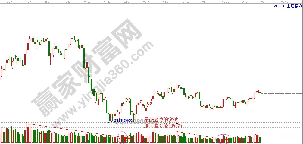 a,引入成交量移動平均線,用以判斷成交量變化的趨勢。一般建議用10日成交量線,在江恩理論中,往往也會使用月或周的量能來分析。