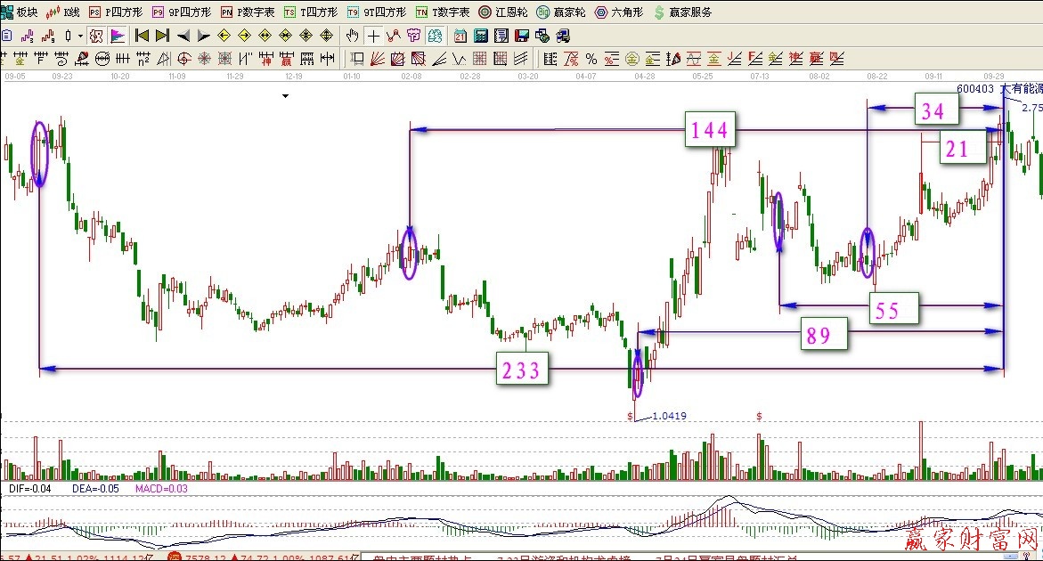 (6) 這個(gè)高點(diǎn)之前的第233個(gè)交易日是2005年9月15日,這個(gè)時(shí)間點(diǎn)之后的5天,也是一個(gè)小型的高點(diǎn)6.76元,這個(gè)波動(dòng)周期之間完成了一次價(jià)格的回歸,6.76元和6.97元相差0.21元。