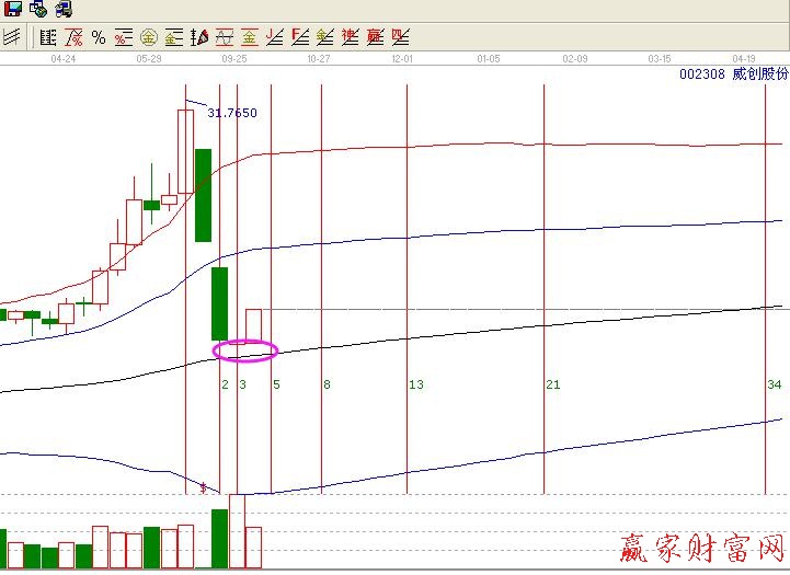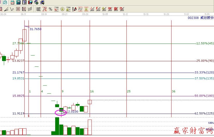 我們我們看下面的兩個圖形,圖1為002308威創股份的周線圖形,我們觀察,個股在從高點31.76下調到第3周止跌,在江恩理論中總結出來了很多重要的循環周期,其中短期循環包括:1小時、2小時、4小時……18小時、24小時、3周、7周、13周、15周、3個月、7個月;而3又是斐波那契神奇數字,因當個股從高點調整或是從低點反彈三周總是一個關鍵的變盤點位置,002308就是在第三周的時間點上時間出現止跌。我們再看圖2,是002308日線圖形。個股在平方時間9的時候止跌,進入一個整理趨勢,在平方時間16的時候開始啟動拉升,這在一定程度上,又和周線的時間窗產生了共振,也就是不同周期之間的共振。因此發生了向上的作用力。