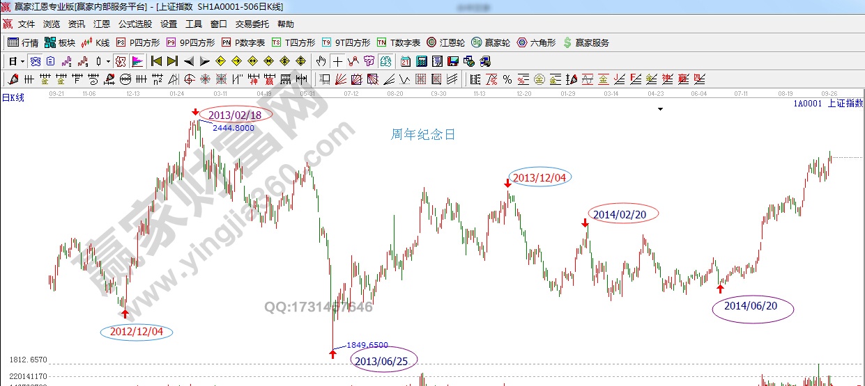 第二,江恩認為,市場的重要頂部及底部周年的紀念日是必須密切留意的。在他的研究里,市場出現轉勢,經常會在歷史性高低位的月份出現。紀念日的意義是,市場經過重要頂部或底部后的一年、兩年,甚至十年,都是重要的時間周期,值得投資者留意。