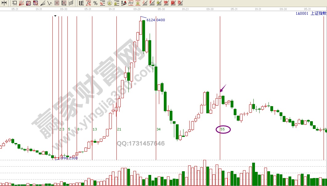 從998點開始向上數一個斐波那契數列,如圖紅色數字標注,到55的時候正好是2009年12月,也就是3478點的次高點位置,新一輪熊市啟動的地方。