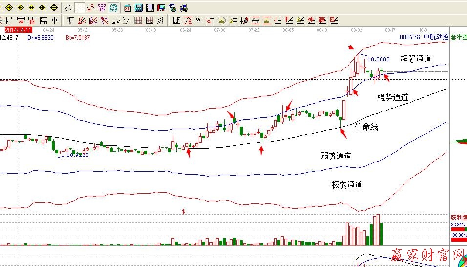 這里先從趨勢(shì)上分析。用到的工具是贏家江恩特有的工具極反通道。極反通道由5條線組成,分為4個(gè)通道,其中,中間這條黑色的線我們稱之為生命線,在生命線上是強(qiáng)勢(shì)區(qū)域,生命線下是弱勢(shì)區(qū)域,通常咱們是建議股民朋友們做生命線上以上的股票,因?yàn)橼厔?shì)強(qiáng)勢(shì),做起來風(fēng)險(xiǎn)小,利潤也是比較可觀的。如圖所示,000738該股近期在極反通道上的顯示,一目了然,站穩(wěn)生命線買,遇到上軌線阻力出,這樣一波下來,大概一周左右的時(shí)間,利潤也有15%左右,關(guān)鍵是你還不用一直盯盤,直接可以用極反通道做出你的計(jì)劃,你只要記住點(diǎn)位就可以了。目前該股回踩藍(lán)色上軌線,是可以考慮的,只要不破16.56元這個(gè)價(jià)格,目標(biāo)就可以看到18.51附近。這是趨勢(shì)上的分析,簡單不?這樣你是不是知道在那里買賣了呢?