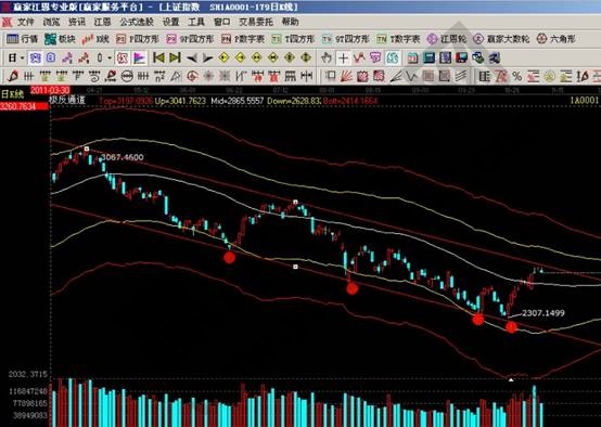 我們回顧一下A股從3067高點下行至11年的2307的這段25%的跌幅走勢,顯然這其中個股是跌的慘不忍睹,但是我們知道機(jī)會是跌出來的,所以大家就可以通過贏家江恩的極反通道哦啊工具看出下行中的操作機(jī)會共有4次,具體如下: