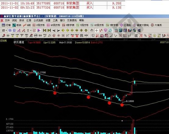 在11年11月1號放2倍量能突破長期下降趨勢通過,并且運行至贏家特色趨勢工具極反通道生命線附近,有突破需要,操作個股技術(shù)需求滿足;再來看消息面,隨之軟件行業(yè)十二五規(guī)劃利好消息帶動,整體板塊異動,軟件用戶通過工具分析,在生命線附近關(guān)注,黃色外軌線獲利出局,兩天獲利16%;