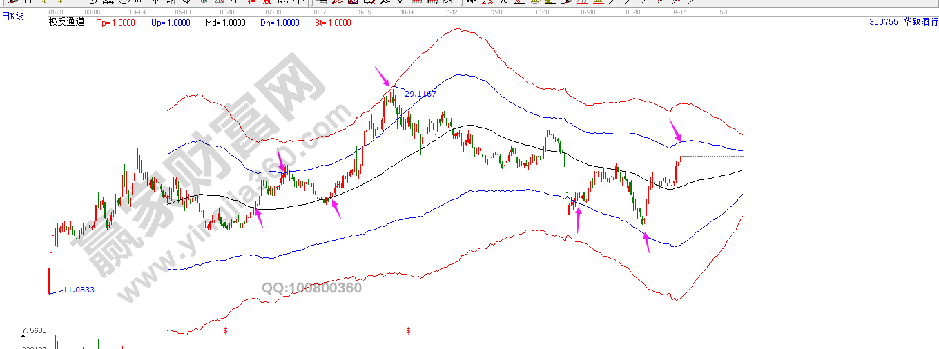 在上面華致酒行的圖形中,所有的波動(dòng),都存在于極反通道五條線四個(gè)通道之內(nèi)。極反通道前一個(gè)月日線中沒有極反通道出現(xiàn),在江恩理論中講研究歷史預(yù)測(cè)未來,我們需要通過一個(gè)月的數(shù)據(jù)搜集和計(jì)算,找到個(gè)股的波動(dòng),然后去生成極反通道圖形。每一個(gè)通道都可以是一個(gè)循環(huán)的起點(diǎn)和終點(diǎn),而四條通道又可以看做是一個(gè)大循環(huán)的起點(diǎn)和終點(diǎn),在大循環(huán)中有小循環(huán),從生命線(中間黑色曲線)開始,向上到藍(lán)色上軌線,可以看做是一個(gè)小的空間循環(huán)起始位置,在實(shí)戰(zhàn)常規(guī)運(yùn)用中,生命線就是一個(gè)最佳的起爆點(diǎn),而藍(lán)色上軌線,則是常規(guī)的賣點(diǎn)位置。當(dāng)個(gè)股下跌方向,藍(lán)色下軌線就是第一個(gè)極限空間位置,當(dāng)?shù)竭_(dá)這個(gè)位置就會(huì)上漲,這個(gè)點(diǎn)位的交易就可以對(duì)標(biāo)散戶期待的抄底交易。而紅色上軌線是一個(gè)通道的極限上漲空間位置。因此大多數(shù)的個(gè)股在到達(dá)這個(gè)極限之后就是一波上漲結(jié)束的最終位置。知道“極”在哪里,才能對(duì)應(yīng)做交易。