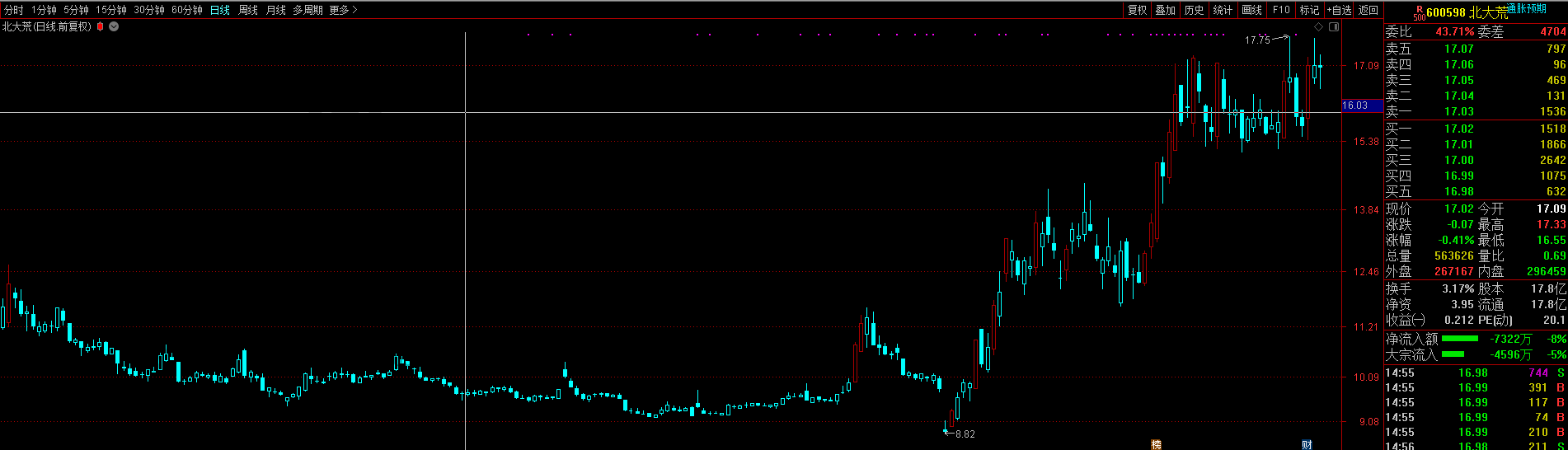 600598北大荒是近期贏家VIP微信群里一名學員操作的股票,圖一里我們通過紅色五彩K線標記出了該股自2019年6月11日至2020年4月30日內所有漲幅大于4個點的中大陽線,圖二是該股自2019年6月11日至2020年4月30日的極反通道圖。通過對比,我們發現一個明顯的規律:中大陽線多出現于極反通道的生命線以上,當下散戶多喜愛短線操作,這也的確是適合散戶資金量小、發揮快進快出優勢的一種操作模式,而短線操作最重要的一點就是一旦介入股票之后需要出現中大陽線快速脫離成本,目的是為了安全,因此短線交易追求的目標必須是中大陽線。通過兩張圖的對比,我們可以直觀的發現極反通道解決了這個難題,說白了想收獲中大陽線,股價必須運行在極反通道之上。如果說股市是一個金礦、一根根中大陽線是金光閃閃的金子的話,那么極反通道生命線就是尋龍分金的龍脈所在,由于篇幅限制本文只舉一例,有興趣鉆研和驗證的朋友可以多找股票案例按照以上的方法對比進行概率統計,我可以很確定的告訴大家,結論還是這樣的:中大陽線必大概率出現在生命線之上!!!