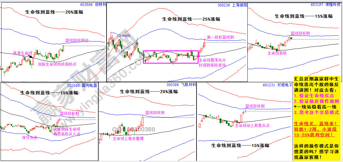 極反通道作為贏家江恩獨有的經典分析工具,接觸過贏家的朋友基本都有了解。只有簡單的5條線,能靈活應用,則:選好股-判趨勢-找買賣-算空間,都可以有效解決。其中,生命線作為強勢股票的啟動點,買在生命線就是買在起漲點,上漲第一目標即為藍色上軌線!那么,生命線入場,上漲到藍色上軌線高拋,持股1-2周,獲利15-25%,就是現在要分享給大家的經典小波段盈利模型。