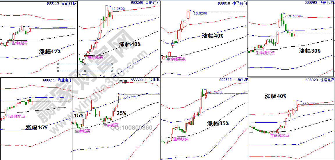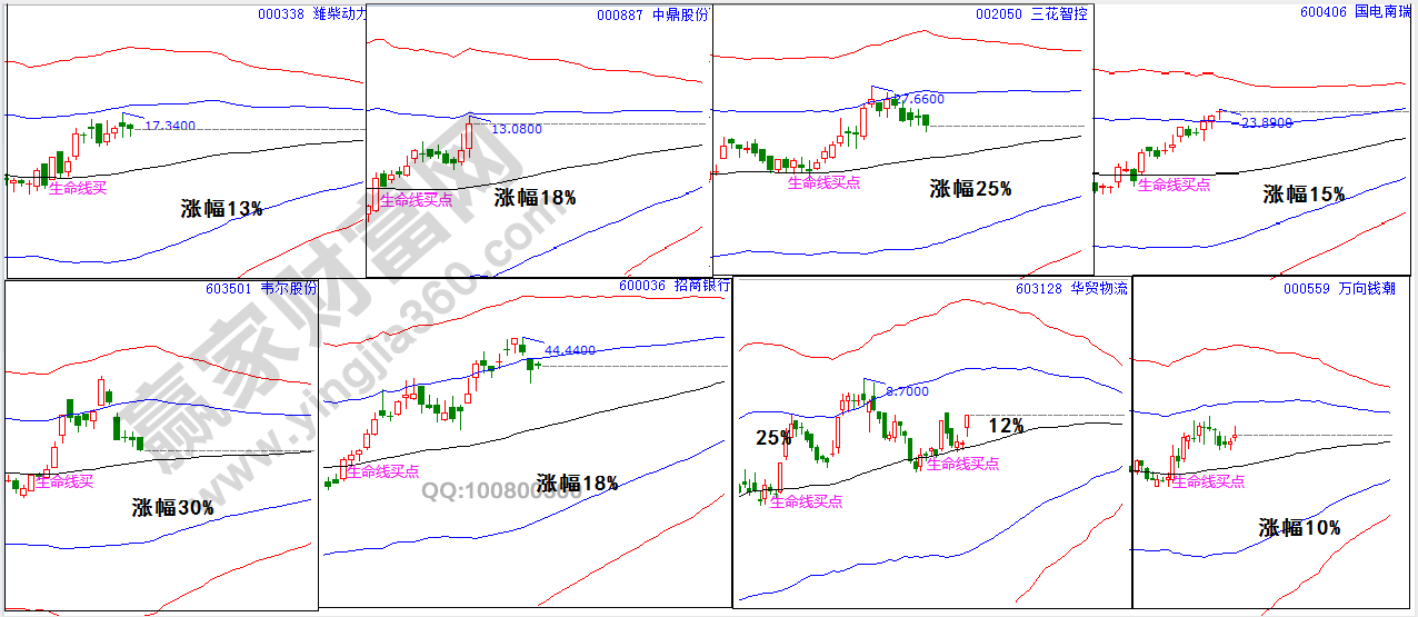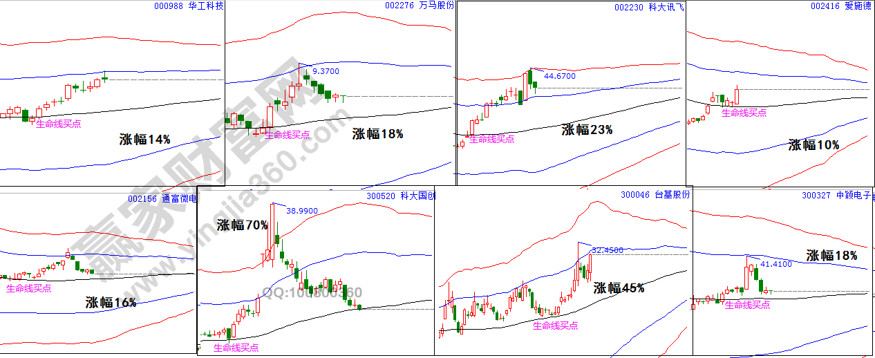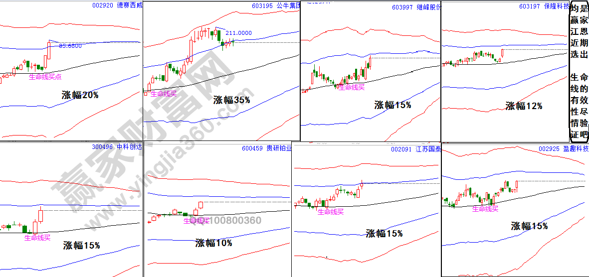 可以看到圖一大部分屬于是生命線到藍(lán)色上軌線的股票,德賽西威和中科創(chuàng)達(dá)都是短短2個(gè)交易從生命線到藍(lán)色上軌線,收益15%-20%,其他個(gè)股雖然中間經(jīng)歷震蕩,但是總的上漲趨勢(shì)沒(méi)有變,15%以上的收益是足足的。圖(2)有一些股票屬于生命線到紅色上軌線的股票。這里的收益就相當(dāng)高了,基本上都在30%以上。