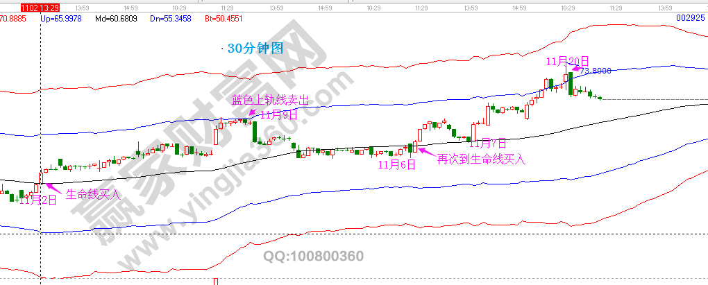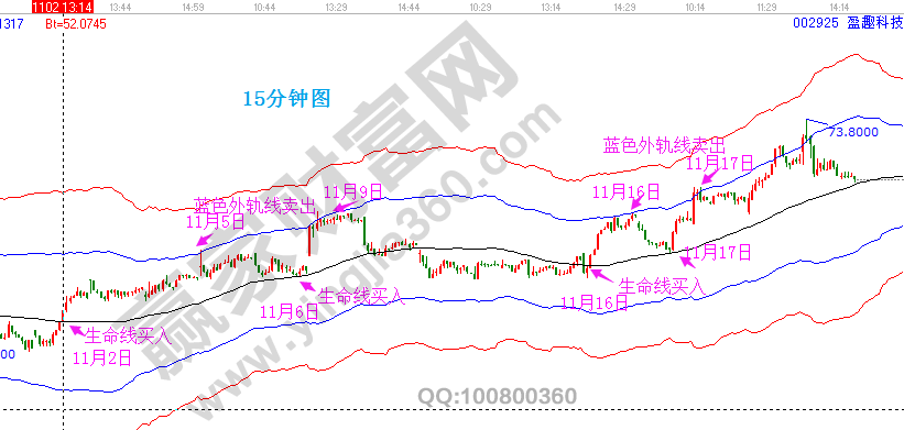 例如盈趣科技,11月2日選出,中間經(jīng)歷了15個(gè)交易日才到藍(lán)色上軌線這里,中間很多時(shí)間都在震蕩,這個(gè)時(shí)候,可以借助15分鐘或者30分鐘極反通道進(jìn)行差價(jià)操作,如圖所示,短周期的走勢(shì)也非常有規(guī)律,可以有效回避因?yàn)閭€(gè)股調(diào)整帶來(lái)的收益降低,大大提高資金利用率。原本生命線到藍(lán)色上軌線的波段空間只有15%,如果加上完美的短周期差價(jià),此波收益將會(huì)達(dá)到30%以上,一年只要把握3個(gè)這樣的機(jī)會(huì),就可以實(shí)現(xiàn)翻倍收益!生命線到藍(lán)色上軌線的股票何其多,擁有了這樣的神器,盈利將不再是任何問(wèn)題!