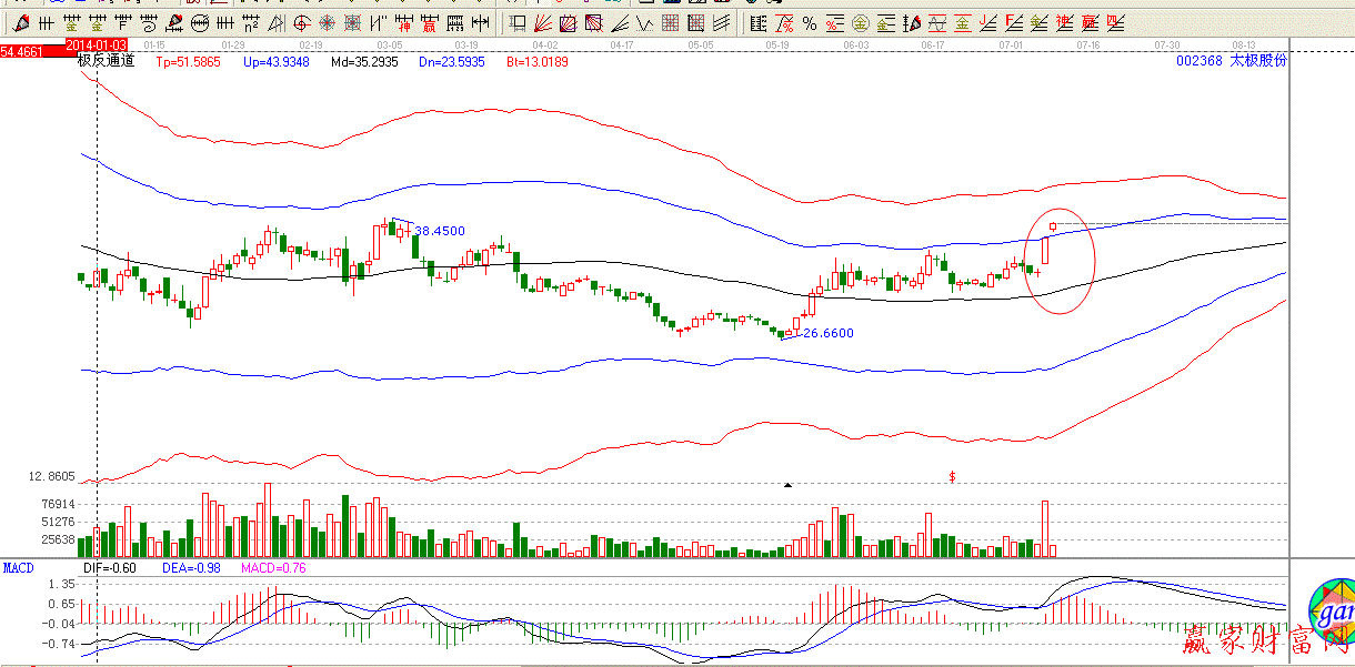 首先,我們通過極反通道來分析一下該股目前狀況。如下圖所示,該股前期一直在生命線上運行,生命線上運行形勢較弱,成交量萎縮配合走勢。出現漲停大陽線拉升之后,股價突破強勢外軌線,漲勢打開,上漲趨勢明顯。此次拉升變強勢外軌線壓力為支撐力。緊接著該股放量漲停。目前該股徘徊在強勢外軌線上方整理,站穩之后看向超強外軌線,隨后會創下新高。