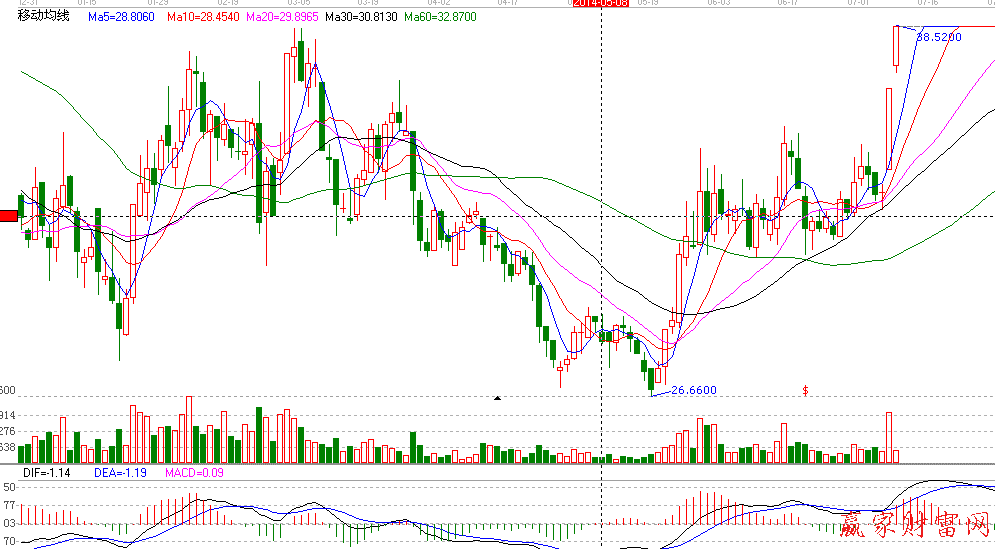 如果覺得上圖指標還不充分,接下來我們來用均線趨勢指標來驗證一下。如下圖所示,該股現在處于拉升的中途,前期到達一個底部之后低點是26.6元,之后均線呈現多頭排列,上升一段時間之后橫盤震蕩,橫盤大概經歷半個月時間,一直站穩30日線,之后出現一陽穿多線的形態站穩各條均線,上漲慣性會持續一段時間。