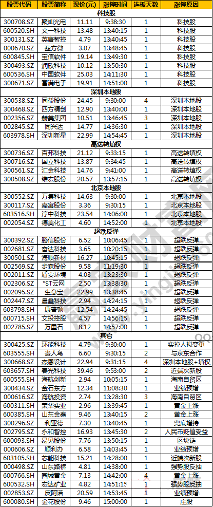 深圳板塊持續活躍,龍頭同益股份再收一字板,杰恩設計漲停;午后科技股全線爆發,中國軟件、英唐智控、盈方微、聚燦光電、潤欣科技等多股漲停。