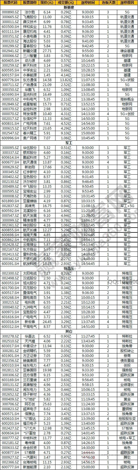 盤面上,5G板塊表現強勢,至純科技(603690)、廣哈通信(300711)等多股漲停;物聯網板塊有所表現,三川智慧(300066)、華鵬飛(300350)等多股漲停;特高壓板塊開盤持續活躍,風范股份(601700)強勢收獲7連板,電科院跟隨漲停;軍民融合板塊開盤集體大漲,鵬起科技(600614)、航天通信(600677)一字板,新勁剛(300629)秒板;高鐵軌交板塊開盤領漲,鼎漢技術(300011)、祥和實業(603500)、飛鹿股份(300665)、永貴電器(300351)集體封板;特斯拉板塊集體沖高,龍頭天汽模(002510)強勢封板。