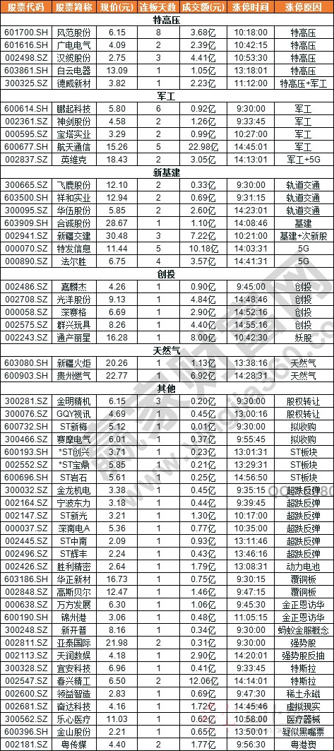 盤面上,天然氣板塊午后異動,貴州燃氣(600903)、新疆火炬(603080)強勢封板;ST長油(601975)盤中先后兩次停牌,收盤大跌23%;高鐵軌交板塊開盤持續(xù)強勢,永貴電器(300351)、祥和實業(yè)(603500)、寶塔實業(yè)(000595)、飛鹿股份(300665)集體封板;風范股份(601700)強勢收獲八連板,帶動特高壓板塊走強,漢纜股份(002498)、廣電電氣(601616)漲停;券商板塊異動,西南證券強勢沖板。