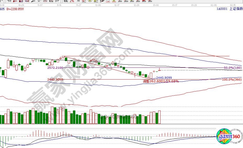 大盤日K線反彈至短線目標位黑色生命線2585附近回落,早盤10:53分贏家江恩系統工具用戶群提示短線高拋,鑒于市場目前依然處于反彈周期內,指數震蕩整理修整短期走勢后,還有機會再度攻擊黑色生命線。空間點位上,江恩百分比延伸線提示2530、2516為10點盤中支撐,2567點為盤中壓力,時間窗口,1月15日、23號為日線時間窗口。操作策略,大盤短線反彈接近目標位,后續轉為震蕩,30分鐘生命線2516附近不破,9號短線高拋的籌碼逢低接回。