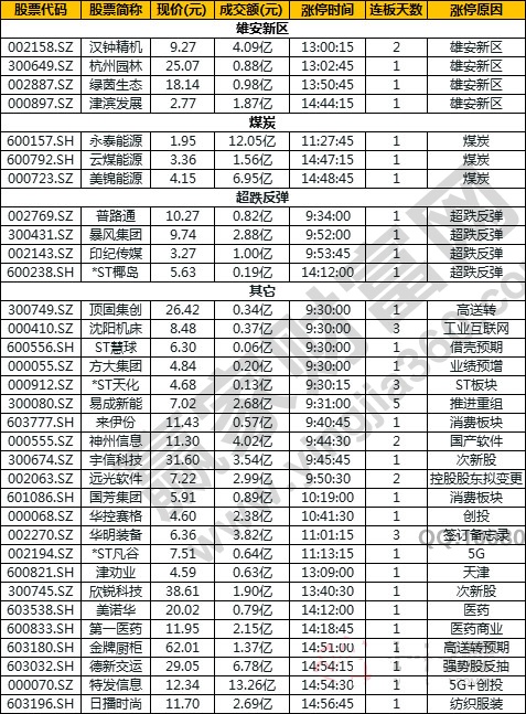 雄安新區、煤炭、超跌反彈 封板效率:一般