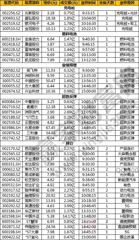 盤面上,午后石墨烯板塊異動,方大炭素(600516)一度大漲逾7%,碳元科技(603133)、寶泰隆(601011)跟隨上漲;充電樁板塊開盤大漲,兆新股份(002256)、盛弘股份(300693)等多股集體漲停;燃料電池板塊低開高走,全柴動力(600218)率先封板,富瑞特裝(300228)等多股隨后漲停;業績預增概念表現亮眼,方大集團(000055)、英飛特(300582)等多股漲停。