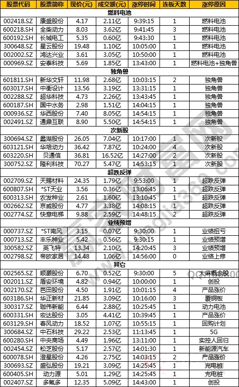 盤面上,午后獨角獸板塊集體走強,超華科技(002288)強勢封板,新華文軒(601811)再度漲停;早盤燃料電池板塊最為強勢,康盛股份(002418)、全柴動力(600218)雙雙封板,板塊內多股漲停;鋰電池板塊逐漸走強,天賜材料(002709)直線封板。