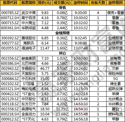 盤面上,業績“爆雷”股全線下挫,科陸電子(002121)、天舟文化(300148)、南寧糖業(000911)、奧維通信(002231)均一字跌停,此前公告均顯示2018年業績“變臉”;新零售板塊開盤強勢,華聯綜超(600361)秒板,南寧百貨(600712)直線封板;業績預增股走強,騰信股份(300392)、海聯訊(300277)、得潤電子(002055)等多股漲停。
