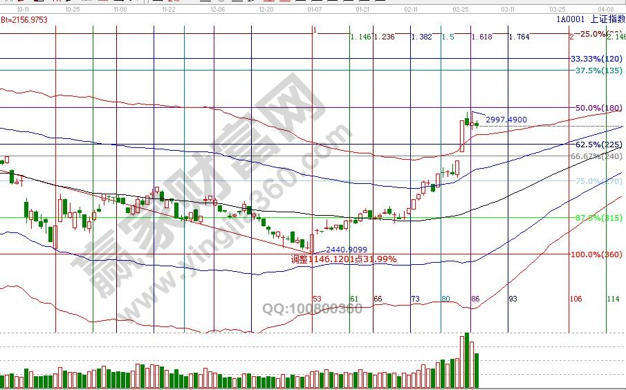 大盤1月中旬突破日線極反通道生命線進入安全區域,為2月持續上攻打下基礎,同時周K線已收盤站上生命線2858點,未來市場回探此位置將成為重要支撐,此線是波段持續走強的參考線。日線震蕩等待短周期極反通道關鍵位上移,空間價格上,江恩輪中輪、百分比延伸線提示,2914、2900為1號支撐,2966、2974點為盤中壓力,日線時間窗口是3月7日。操作策略,大盤維持日線震蕩,持股上享受瘋狂的同時不斷提高止賺位,即保護了利潤又可將利潤最大化,無股等待方向確立時跟進,整體倉位保持在6成左右。