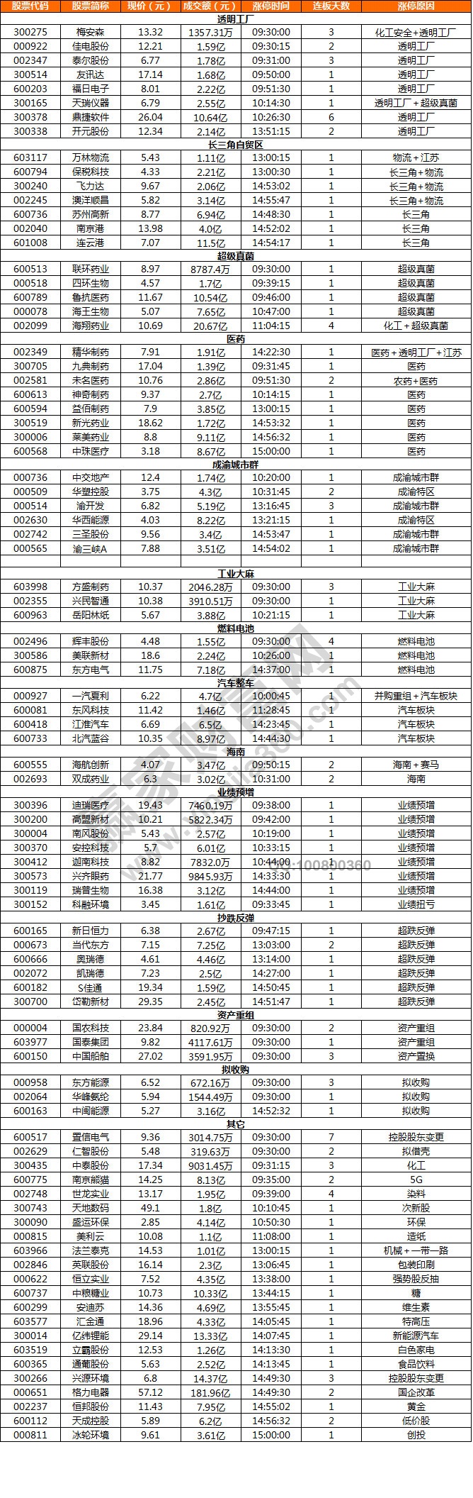 盤面上,午后港口板塊開盤走強,保稅科技(600794)直線封板,南京港(002040)、連云港等港口股沖擊漲停,但持續性欠佳有所回落,臨近尾盤又再度走強回封,消息面上:長三角區域將誕生新的自貿區;受厚樸投資考慮組建財團出價收購格力電器15%股份的消息影響,格力電器再度回封漲停,全天成交額超180億元;一帶一路龍頭國際實業(000159)打開漲停板,快速跳水翻綠跌超7%帶動指數下行,隨后拉扯略有回暖的化工板塊再度下挫,魯北化工(600727)開板,浙江龍盛(600352)持續走低;但今日超級細菌概念股全線爆發,魯抗醫藥(600789)、海王生物(000078)、聯環藥業(600513)強勢封板,消息面上:美國多地爆發耳念珠菌真菌病毒,中國18例感染;透明工產板塊延續漲勢,鼎捷軟件(300378)走出六連板走勢,泰爾股份(002347)三連板。