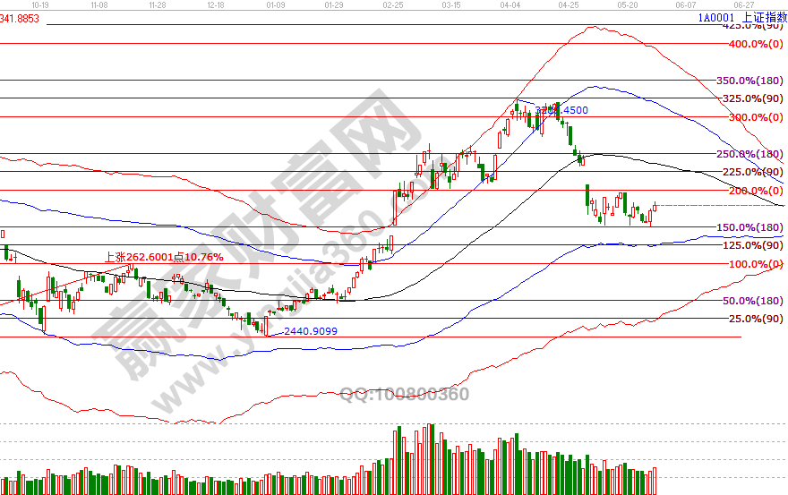 5月指數三次下探一直強勢的關鍵位2840點,分別是8(9)號、20號及27號,9號及27號下探按工具信號做了明確的參與信號,指數延續昨日上攻動作走高,盤中在贏家江恩系統工具VIP學員群提示,反彈進入第一目標2928-2960(15分鐘藍色上軌線)可先獲利了解三分之一籌碼,待量能有效配合突破波段百分比零度位2966后再看高至生命線,29號是5月最后一個時間窗口。29號盤中壓力是225度2944點、180度2928點,盤中支撐是45度2877、0度2860點。操作策略,指數擊破黑色生命線進入弱勢區域,整體持倉保持在3-5成。