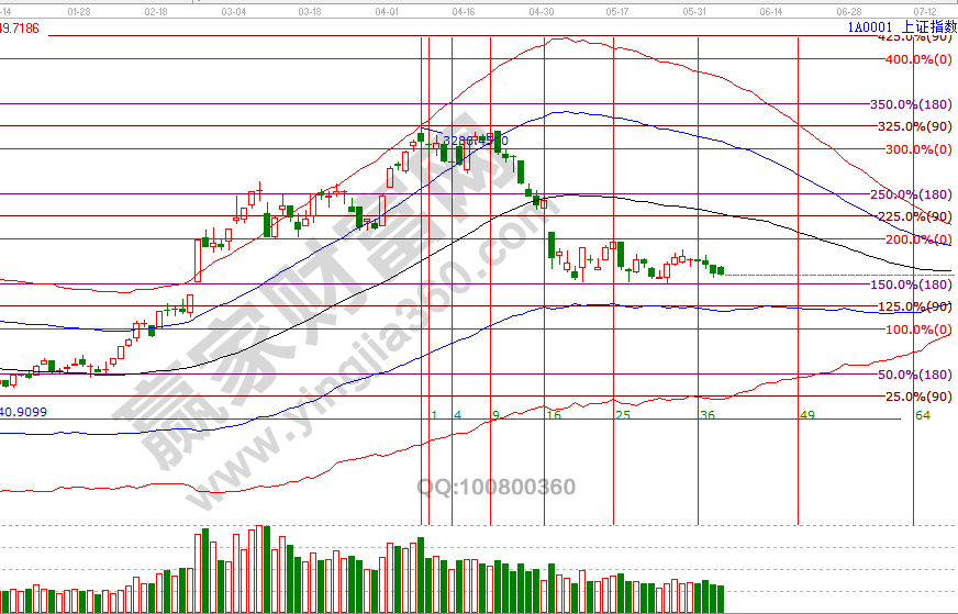 大盤時間窗口未給出明確的方向選擇,延續空間分析波段百分比延伸線1倍循環180度2834點與2倍零度位2966點區間震蕩,因端午假期,本周僅剩一個交易日,如明天市場延續震蕩格局,則下周將是周線、日線時間窗口期,維持1個月的橫盤后無論是上下市場都會給一個方向。隨著時間的推移,市場人氣情緒必會有一次爆發,從技術角度研究,百分比2834-2780(極反通道藍色下軌線)這里出現轉強信號則能帶動場外資金入場。當前贏家江恩給出的策略為,高風險者在2840附近可以參與,運用區間交易法;低風險者可以等出現中陽或指數靠近藍色下軌線附近開倉。6號盤中壓力是45度2877點、90度2894點,盤中支撐是315度2844、270度2829點。操作策略,指數擊破黑色生命線進入弱勢區域,整體持倉保持在3-4成,做到進可攻退可守。