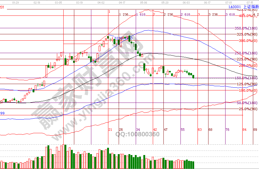 江恩理論中有一條分析規則四次遇阻力(支撐)而破,價格分析中波段百分比延伸線1倍循環180度2834點,指數按規則第四次觸碰時擊破,結合趨勢判斷,極反通道藍色下軌線是止跌重要參考線。按歷史規律,市場不同階段的重要拐點均在極反通道5條線上,盤中擊破2834點時,贏家江恩技術服務團隊在VIP學員群中談到,4月22號提示風險帶領大家減倉轉入休息,5月份二次在2840點是高風險者分批博弈,應用區間交易法均獲得利潤。市場下破2834點,延續調整是低風險者空倉或輕倉者的機會,市場走勢是有規律可循,而贏家江恩系統中極反通道就是一個直觀、有效的判勢工具,用規則紀律行事,買在支撐賣在壓力。本周是周線、日線時間窗口共振時間段,跟隨市場觀察是否與價格形成時價四方共振,6月10號盤中壓力是315度2844點、0度2860點,盤中支撐是180度2800、135度2786點。操作策略,指數擊破黑色生命線進入弱勢區域,整體持倉保持在3-4成,做到進可攻退可守。