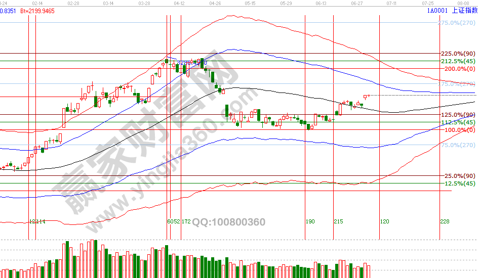 3、4號是贏家江恩系統時間周期工具預判的指數7月第一個時間窗口,周二十字星報收為近期方向選擇做準備。1號大勢分析中談到,指數從贏家江恩一直強調的2840反彈至今已上行200點,月線極反通道生命線是3065點,此點位同短周期15、30、60分鐘藍色上軌線形成共振,江恩輪中輪90度3051點,兩個趨勢工具結合得出3051-3065是未來幾天壓力位,此位置相比2840處已不具備大幅開新倉要求,查看先行指數上證50日線圖會更清晰,不開新倉不代表看空,目前還未出現反彈結束信號(謹防極反通道周期共振反壓),提高止賺位保持一定倉位持倉做應對,7月3號盤中壓力是135度3055點、180度3067點,盤中支撐是90度3036點、45度3016點,今明天是7月第一個時間窗口。操作策略,指數極反通道生命線上安全區域震蕩上攻,反彈動作還在延續,3051-3067區間附近高倉位可以分批兌現利潤,整體持倉保持3-5成。
