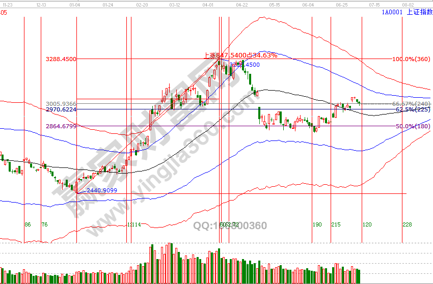 2號(hào)午盤(pán)在贏家江恩系統(tǒng)學(xué)員區(qū)及當(dāng)日收盤(pán)分析中,講述了通過(guò)極反通道判斷出的短周期周期共振警示信號(hào),所提出結(jié)論目前正在一步步得到市場(chǎng)的確認(rèn),逐級(jí)回踩生命線(xiàn),這也是近兩日一直談到不讓開(kāi)新倉(cāng)的技術(shù)依據(jù),短期警示信號(hào)是結(jié)束還是展開(kāi)新的周期修整,將于今天見(jiàn)分曉。整體上2840附近所展開(kāi)的反彈還沒(méi)有結(jié)束,短線(xiàn)具有參考價(jià)值就是60分鐘的生命線(xiàn)位置。,7月5號(hào)盤(pán)中壓力是45度3016點(diǎn)、90度3036點(diǎn),盤(pán)中支撐是315度2978點(diǎn),下個(gè)時(shí)間窗口是15號(hào)。操作策略,指數(shù)極反通道生命線(xiàn)上安全區(qū)域震蕩上攻,反彈動(dòng)作還未結(jié)束,短線(xiàn)關(guān)注2978-2983位置,整體持倉(cāng)保持3-5成。