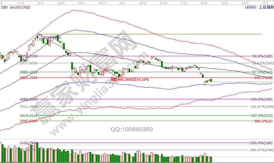 9號大盤最高點2808點(測算反壓2808一點不差),最低點2770點(測算支撐2772,僅相差2點),20年來贏家江恩大勢分析均是通過系統工具規則提前測算,歷史上重要時間、價格拐點都做有判斷,預判未來市場最有效的方法就是研究歷史。再談行情,下跌趨勢已確認,這在月初已闡述過,未來市場重要的時間參考點是9月、空間位置是月線藍色下軌線(學員通過極反通道工具獲取位置),這個觀點是7月中下旬公開課中有講過,當前這里定性的是反抽(級別很小,反彈都稱不上),保持6號觀點空間上看2744-2822,時間上9、16號,8號分析中談到價格需要等待時間,本周需要觀察等待期是以時間換取還是空間換取,因為級別太小,信號持續度隨之減弱,周初繼續觀察日線藍色下軌線支撐。8月12號盤中壓力是180度2800點、135度2786點,盤中支撐是45度2757點、0度2743點,日線時間窗口是16號。操作策略,指數生命線下弱勢區域運行,藍色下軌線震蕩,激進者最多3成倉交易,穩健者空倉休息。