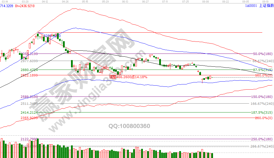 12號的分析中講了時價等倍關(guān)系及反抽力度之弱,16號將遇日線時間窗口,代表價格將再會有一次劇烈波動,跟蹤好指數(shù)短期走勢,目前關(guān)系是大周期制約小周期,小周期引導(dǎo)大周期,其結(jié)論是反抽還有空間(時間未到)但受趨勢限制,這也是12號談到第一次分批先獲利部分籌碼的原因。8月14號盤中壓力是225度2815點、270度2829點,盤中支撐是135度2786點、90度2772點,本周五日線時間窗口。操作策略,指數(shù)生命線下弱勢區(qū)運行,激進者3成倉交易,穩(wěn)健者空倉休息。