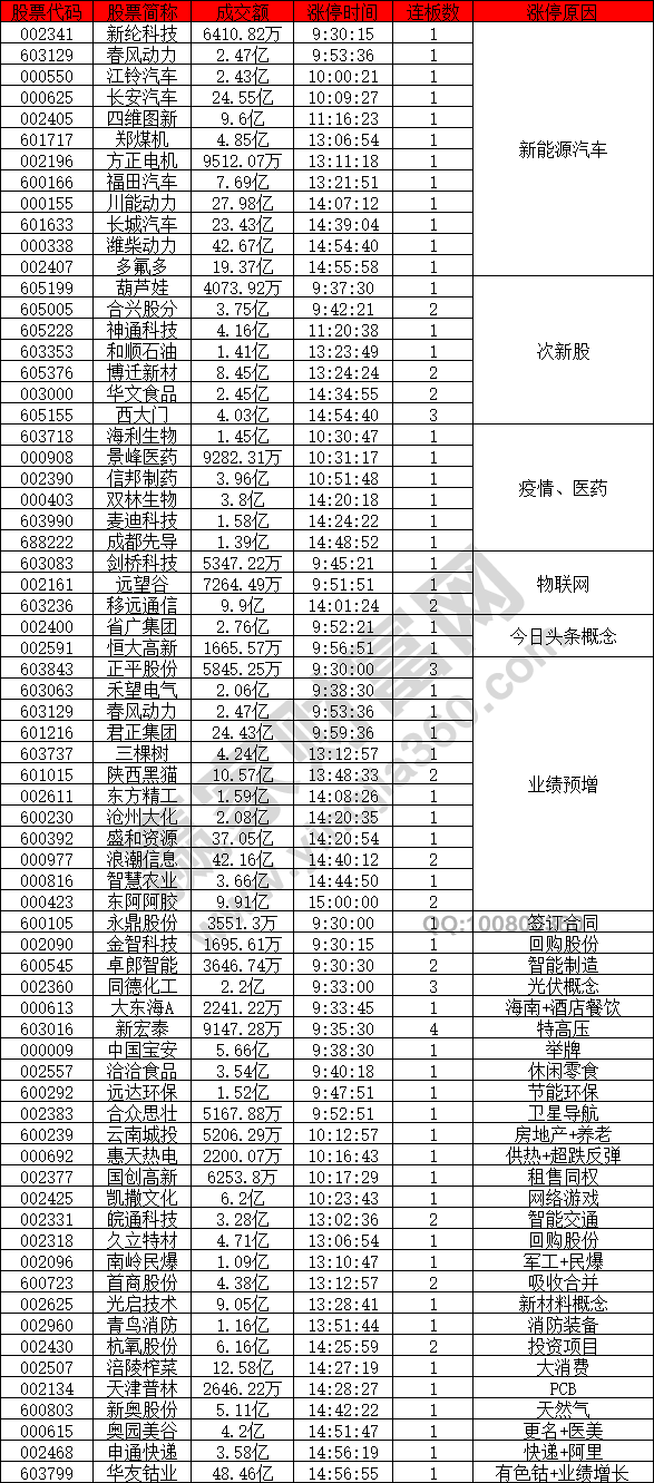 盤面上看,汽車整車板塊全天強勢,江鈴汽車(000550)、長安汽車、福田汽車(600166)、長城汽車(601633)等多股漲停;注冊制次新股大幅回調,板塊整體跌逾5%,C信測(300938)、C藥易購(300937)跌逾30%,C秋田微(300939)跌25%;機場航運板塊持續走弱,上海機場(600009)一字跌停,海航控股(600221)觸及跌停;稀土板塊午后則震蕩走高,盛和資源(600392)、川能動力(000155)拉升漲停,龍磁科技(300835)漲10%;優質龍頭股今日整體較強,同花順(300033)漂亮100指數收漲逾2%。