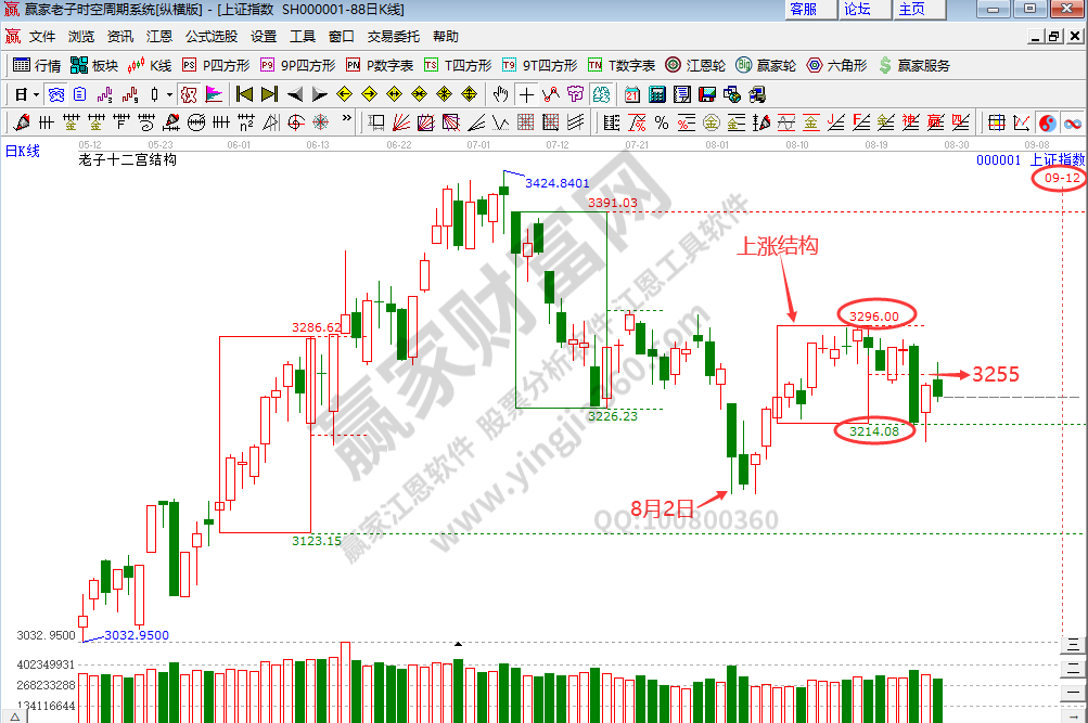 滬指8月26日以陰線收盤,工具信號顯示指數當前處于觀察期,等待工具信號對方向的進一步確認。指數按預期在老子十二宮上漲結構綠色支撐線3214點獲得支撐后反抽警戒線3255點,維持前期觀點,如站上3255點,短期上攻有望延續至結構頂部3296點;如不能站上此線,將再次下探3214點和8月2日低點3155點。時間方面,老子十二宮顯示下一個時間窗口為9月12日。操作策略上,極反通道生命線下弱勢區域內運行,減少操作頻次,以輕倉操作或空倉休息為主,繼續密切關注證券、銀行、保險這些大金融板塊。