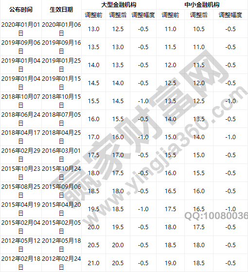 今年2020年1月1號的時候,央行公布將于6號將金融機構存款準備金率下調0.5百分點。也就是說,大金融機構準備金率為12.50%,中小金融機構存款準備金率為10.50%。