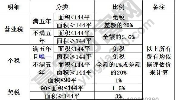 個人所得稅:滿五年,是可以免除的,如果不夠五年,那么就要按照房價漲幅的20%或者成交價的1%交納;