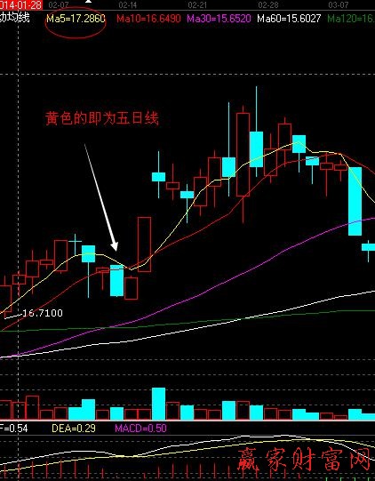 首先五日均線在股市圖當中的上方都會有一個MA5的標志,在各個交易軟件當中都會有這樣的均線,如下圖所示