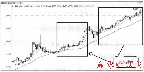 如果商品價格的均線形成了明顯的多頭排列,此時的操作方法相當簡單,就是逢低做多,但不要盲目地猜頂,如下圖所示。