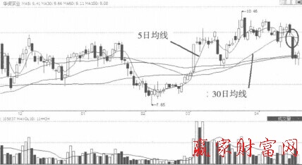 如圖所示,在華資實業的日K線中,5日均線在相繼與60日、100日均線形成死又之后,股價就已經登上熊途之中。下跌過程既然巳經在所難免,投資者就應當率先出貨。該股在探底最低價格5.52元的時候,累計的下跌幅度已經高達38%。死叉后提前出貨的投資者將因此而減少不小的損失。