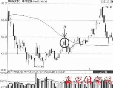 在A處,中信證券(600030)的股價在上漲過程中受到60周均線的壓制,在K線上出現了一個帶有長上影線的中陰線,這表明60周均線壓力較大,后市應有回調。通過圖中可以看到該股經過6周的整理才突破了60周均線。