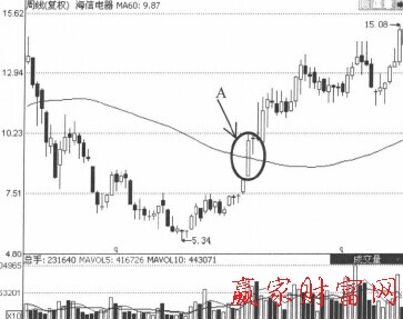 在A處,海信電器(600060)的股價利用一根大陽線向上突破了60周均線的壓制,由于是強勢突破,所以這里略作回調就開始上攻。